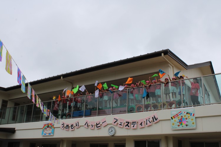 5歳児の子どもたちが二階から旗を振って晴れやかな笑顔を見せてくれました。