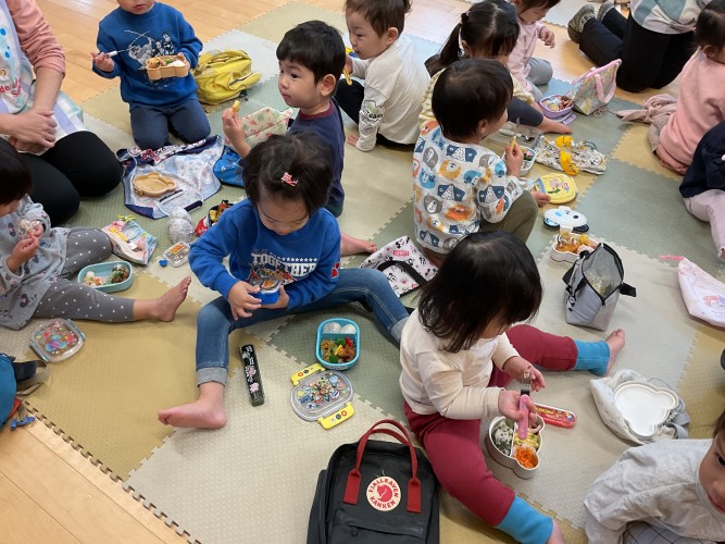 嬉しいお弁当タイム!!「見て見てー!」と見せ合って嬉しそうな子どもたちでした。