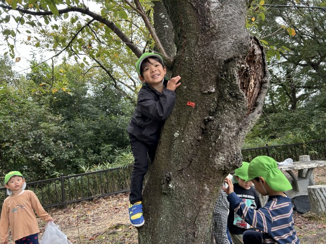 無事2クラスを送り届けたぶどう組(5歳児)は、森林の中を自然に触れながらわいわい広場に到着!!!