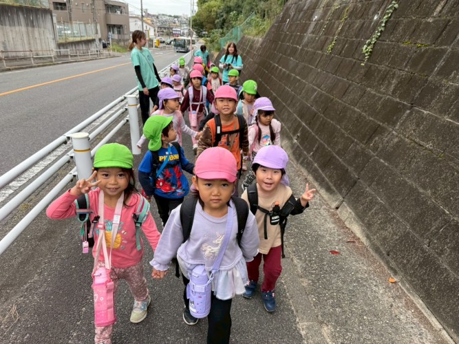 ぶどう組(5歳児)がとまと組(3歳児)れもん組(4歳児)と手を繋いで歩いて...