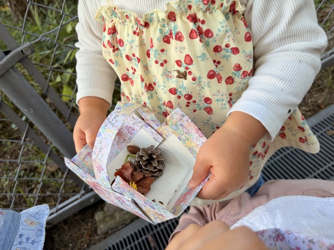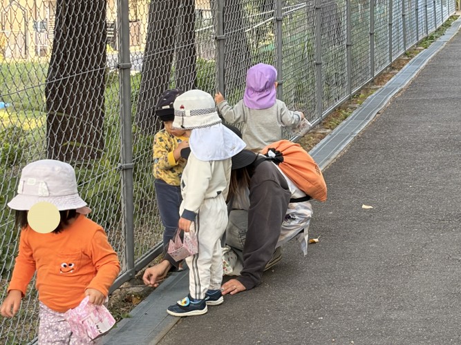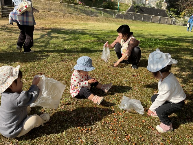 「どんぐりたくさんあるね〜」どんぐり拾いをしたり