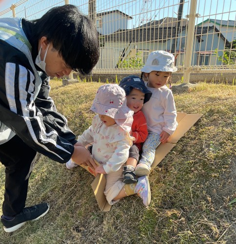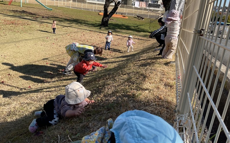 さくらんぼ組(0歳児)といちご組(1歳児)一緒に松林公園へ
